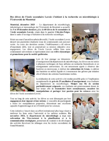 Accueil / Non classifié(e) / DES ÉLÈVES DE L’ÉCOLE SECONDAIRE LAVOIE S’INITIENT À LA RECHERCHE EN MICROBIOLOGIE À L’UNIVERSITÉ DE MONTRÉAL / Communiqué école Lavoie Déc 2025